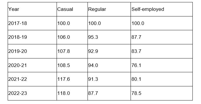 - As per the PLFS data, only the real earnings of casual workers have risen marginally. For others, it is a decline.