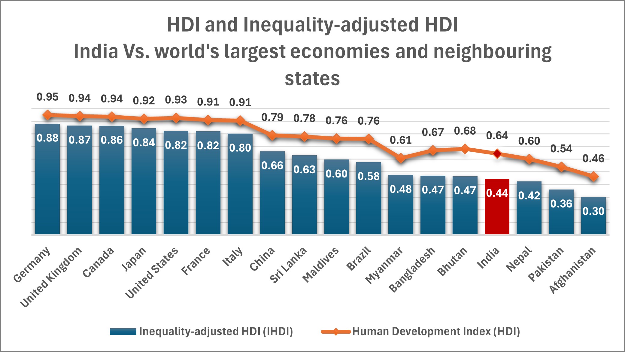 India’s HDI and IHDI rankings are far lower than those of the world’s other ten largest economies.